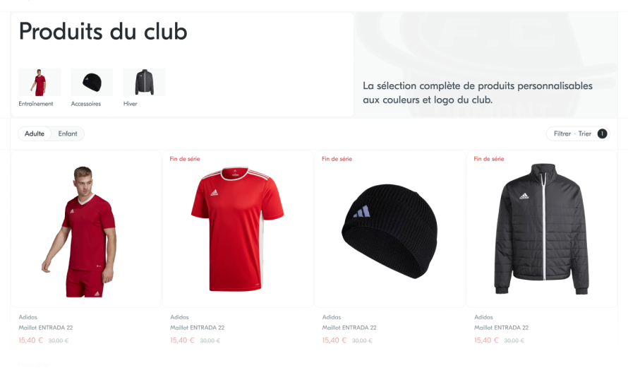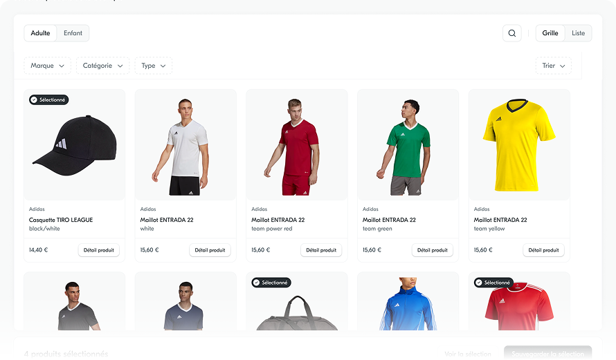 Sélectionnez les produits que vous souhaitez mettre en avant et laissez les bénévoles du club personnaliser leur site e-commerce en y ajoutant leurs couleurs et leur logo. Modifiez la sélection des produits du club autant que vous le souhaitez.