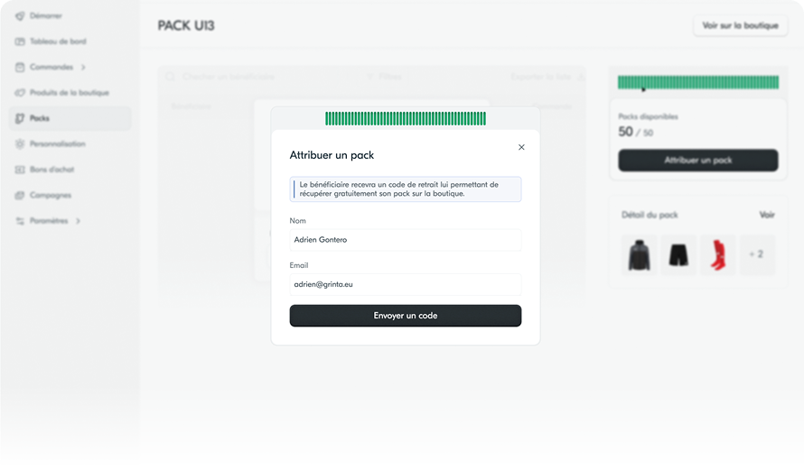 La solution packs de Grinta vous aide à configurer les packs avant de les diffuser sur les boutiques de vos clubs et par email. Collectez ensuite les paiements des licenciés et suivez vos commandes depuis votre tableau de bord.