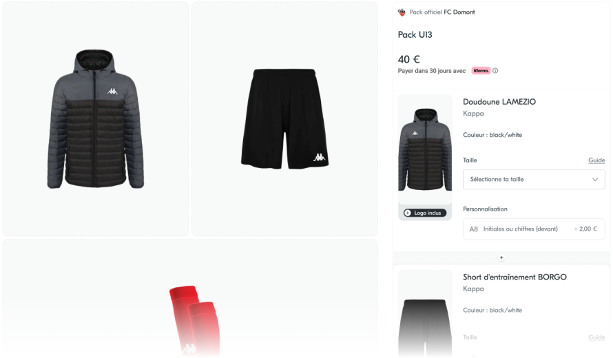 Déchargez les bénévoles du temps passé à collecter les tailles et les paiements des licenciés. Créez des bons d’achat nominatifs. Le licencié peut payer son pack en ligne via CB, Paypal, GooglePay, Apple Pay, Klarna ou à l’aide du bon d’achat remis par le club.
